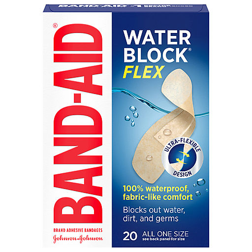 Cover minor cuts, scrapes, and wounds and block out water, dirt, and germs that may cause infection with Band-Aid Brand Water Block Flex Adhesive Bandages. These 100% waterproof, sterile bandages feature an ultra-flexible design and fabric-like material for comfortable, dependable protection, even when wet. Durable and easy to apply, the bandages have a nonstick Quilt-Aid Comfort Pad to cushion painful wounds as well as a four-sided adhesive that keeps the pad dry under wet conditions. From the #1 doctor-recommended brand, the waterproof bandages stick to the skin, not the wound, for gentle and easy removal. Plus, they make a great addition to at-home first aid kits for minor wound care. For best results, apply these sterile adhesive bandages to clean, dry skin and replace as needed. For infection protection, apply Neosporin First Aid Antibiotic to wound before covering with Band-Aid Brand Adhesive Bandage.