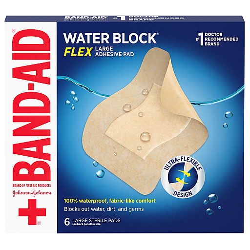 Cover minor cuts, scrapes, and wounds and block out water, dirt, and germs that may cause infection with Band-Aid Brand of First Aid Products Water Block Flex, Large Adhesive Pads. Great for larger wounds on arms, legs, elbows, and knees, these 100% waterproof, sterile bandage pads feature a comfortable, ultra-flexible design and fabric-like material for easy application and durable protection, even when wet. The large bandages have a non-stick QuiltAid Comfort Pad to cushion painful wounds as well as a four-sided adhesive that keeps the pad dry under wet conditions. From the #1 doctor-recommended brand, the waterproof pad adheres to the skin, not the wound, for gentle and easy removal. Plus, they make a great addition to a home first aid kit for minor wound care. For best results, apply these sterile adhesive pads to clean, dry skin and replace as needed. For infection protection, apply Neosporin First Aid Antibiotic to wound before covering. Contains pads measuring 3.5 in by 4.5 in.