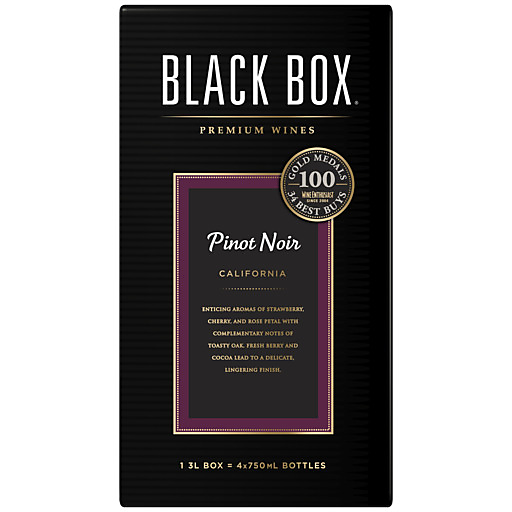 Black Box Pinot Noir is a light-bodied red wine that comes in a sleek, portable box. This box wine has enticing aromas of cherry, red berry, and light oak leading to a velvety, smooth finish. This fruit-forward red wine pairs delightfully with roasted chicken, cheese and vegetables. Black Box Pinot Noir is produced using California grapes, and is great for a variety of occasions, whether you're entertaining friends and family at an outdoor barbecue or when you are unwinding after a long day of work. Each 3 L box contains about 4 (750 ml) bottles of wine with 13% alcohol by volume. The convenient box is shatterproof and resealable, making any outing easy. Plus, the wine stays fresh for up to 6 weeks after opening, giving you plenty of time to enjoy it. Black Box is the most awarded boxed wine. In addition to Pinot Noir, Black Box also offers Cabernet Sauvignon, Malbec, Merlot and other varieties.