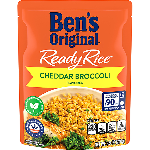 BEN'S ORIGINAL Ready Rice Cheddar Broccoli Flavored Rice is a delightfully creamy microwave rice side dish that is ready to enjoy in just 90 seconds. This deliciously seasoned long grain rice offers the rich taste of cheddar and the flavor of wholesome broccoli for a cooked rice meal you'll love. Available in a convenient BPA-free microwavable rice pouch, BEN'S ORIGINAL Ready Rice eliminates prep and cleanup to help you enjoy a flavorful meal quicker. All you have to do is place the cheddar broccoli rice pouch in the microwave and cook it for 90 seconds, or thoroughly heat the contents of the pouch in a skillet until ready to serve. Pair this flavored rice with your favorite meats, use it as a base for a tasty casserole, or serve it plain. This rice is vegetarian, contains no artificial flavors, and has no colors from artificial sources. BEN'S ORIGINAL is dedicated to creating meals and experiences that offer everyone a seat at the table.