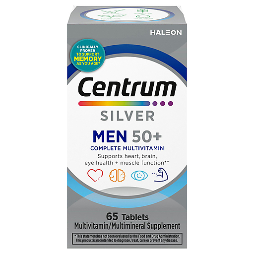 Centrum Silver Multivitamin for Men 50 Plus brings you a tailored multivitamin/multimineral supplement that contains micronutrients to help support full body wellness, complete from A to zinc (1). This daily multivitamin for men over 50 contains essential nutrients, including vitamin D and magnesium to help maintain muscle health, B Vitamins to help promote heart health, zinc and B Vitamins to help support normal brain function, lutein and vitamins A, C, and E to support healthy eyes (1, 2, 3). Key micronutrients in these vitamin supplements help fill in nutritional gaps to promote overall wellness and vitality (1). This senior multivitamin for men is a verified Non-GMO (4) and gluten free multivitamin supplement for men to fit a variety of dietary preferences. Centrum Silver men's multivitamin tablets feature a smooth coating that makes these multivitamins for seniors easy to swallow. Simply take one of these senior men's vitamins daily to provide your body with key vitamins and minerals. Help support full body wellness (1) with Centrum multivitamins, the #1 doctor and pharmacist recommended brand.(1) These statements have not been evaluated by the Food and Drug Administration. This product is not intended to diagnose, treat, cure or prevent any disease.(2) Not a replacement for cholesterol-lowering drugs(3) This product is not intended to provide daily intake of lutein. Take with a diet rich in fruits and vegetables(4) Non-GMO applies to Centrum and Centrum Silver tablets only; learn more at Centrum's official website