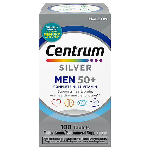 Centrum Silver Multivitamin for Men 50 Plus brings you a tailored multivitamin/multimineral supplement that contains micronutrients to help support full body wellness, complete from A to zinc (1). This daily multivitamin for men over 50 contains essential nutrients, including vitamin D and magnesium to help maintain muscle health, B Vitamins to help promote heart health, zinc and B Vitamins to help support normal brain function, lutein and vitamins A, C, and E to support healthy eyes (1, 2, 3). Key micronutrients in these vitamin supplements help fill in nutritional gaps to promote overall wellness and vitality (1). This senior multivitamin for men is a verified Non-GMO (4) and gluten free multivitamin supplement for men to fit a variety of dietary preferences. Centrum Silver men's multivitamin tablets feature a smooth coating that makes these multivitamins for seniors easy to swallow. Simply take one of these senior men's vitamins daily to provide your body with key vitamins and minerals. Help support full body wellness (1) with Centrum multivitamins, the #1 doctor and pharmacist recommended brand. (1) These statements have not been evaluated by the Food and Drug Administration. This product is not intended to diagnose, treat, cure or prevent any disease. (2) Not a replacement for cholesterol-lowering drugs (3) This product is not intended to provide daily intake of lutein. Take with a diet rich in fruits and vegetables (4) Non-GMO applies to Centrum and Centrum Silver tablets only; learn more at Centrum's official website