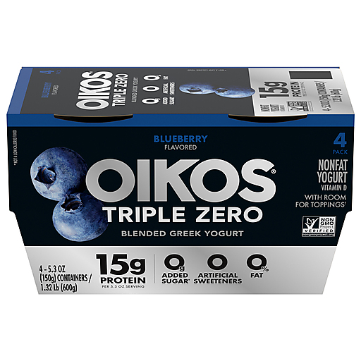 Enjoy epic tastes with Oikos Triple Zero Nonfat Blueberry Greek Yogurt Pack, four delicious nonfat Greek yogurt cups with more of what you want and less of what you don’t. Each Oikos Triple Zero yogurt cup contains 0% fat, 0g added sugar* per 5.3 oz serving and 0 artificial sweeteners. Our blueberry flavored Greek yogurt packs a punch with 15 grams of protein per serving, so you can always have dependable, high protein snacks with zero holding you back. Because when you feel strong, you are unstoppable. With protein and deliciousness, this Greek sugar free nonfat yogurt can help you strive to reach your potential with every serving. Protein is important - an essential nutrient that we need in our diet - and Oikos Triple Zero cups are great tasting, convenient solutions for adding complete protein every day. Pack a Greek nonfat yogurt cup for days that start at a sprint and enjoy a delicious boost of protein at lunch. Or throw in your favorite fruit or toppings for an extra refreshing snack. For even more reasons to go Greek, try Oikos Pro snack cups with 20g of protein per serving or Oikos Blended with chunks of real fruit. Oikos Greek yogurt — Stronger Makes Everything Better (R). *Not a low-calorie food.