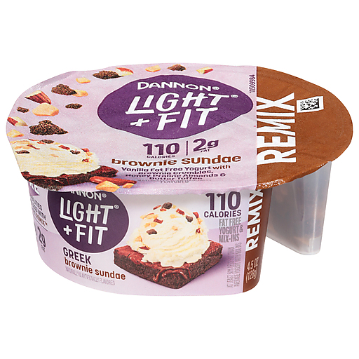 Looking for a delicious fat free yogurt with a fierce flavor and craveable mix-ins? Give your taste buds a reason to rejoice with Dannon Light + Fit REMIX Brownie Sundae Vanilla Fat Free Greek Yogurt with Brownie Crumbles, Honey Praline Almonds and Butter Toffee Mix-Ins. Remix your snacks and treat yourself with brownie crumbles, honey praline almonds and butter toffee over Greek vanilla fat free yogurt. Every bite of this REMIX light yogurt* snack cup has a taste that just keeps bringing it, making it easy to enjoy snacks you can feel good about having on repeat. At Light + Fit, our goal is to help you do you while balancing a healthy diet by serving up some delightfully creamy Greek yogurt with sensational flavor. Light + Fit REMIX fat free Greek yogurt come in single-serve cups, so you can live your life uninterrupted and enjoy them on the go. Protein is an essential nutrient we need in our diets, and with 110 calories and 10 grams of protein per 4.5 ounce serving, this Light + Fit yogurt is a deliciously satisfying and convenient option for adding complete protein every day. Knockout taste. Epic mix-ins. Snacking mic-drops. That’s REMIX. It’s the party crew of snacking you can feel great about. Go full-on fierce, mix it up and take your snacking routine to anything but routine. Pack a few Light + Fit REMIX yogurt cups and enjoy at work or as an on the go snack. Or grab a cup to make breakfast and home snacking more craveable. The mixabilities are endless with Light + Fit REMIX. *50% less fat than average yogurt with mix-ins; Light & Fit Remix: 110 calories, 2g fat; Average yogurt with mix-ins: 155 calories, 4g fat per 4.5oz