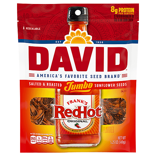 Kick it up a notch and grab a bag of DAVID Frank's RedHot Flavored Jumbo Sunflower Seeds, a delicious snack with the perfect blend of flavor and heat. DAVID Frank's RedHot Seeds offer a spicy and satisfying snack on the go to tide you over through the home stretch. Each 5.25-ounce, individually packaged bag contains about 2 servings with 180 calories and 8 grams of protein per serving. These Frank's RedHot Sauce flavored seeds make perfect travel snacks and are gluten-free. David Sunflower Seeds provide a quality difference that you can taste with select top-quality sunflower seeds, roasted and seasoned to perfection. Contains 1 bag of DAVID Frank's RedHot Jumbo Sunflower Seeds, 5.25 ounces.