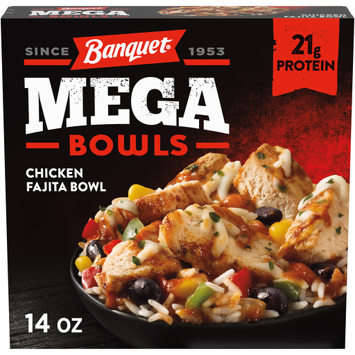 Banquet Mega Bowls Chicken Fajita frozen meal brings exciting flavor to your table. Featuring chicken breast and ranchero sauce layered on a bed of rice, topped with a blend of red and green bell peppers, onions, corn, black beans and cheese for a delicious fajita chicken bowl with a kick. This frozen rice bowl offers 21g protein per serving to put hunger in its place. Enjoy Banquet Mega Bowls as flavorful frozen lunches or quick and easy frozen dinners any day of the week. Preparation of these ready made meals is easy. Just follow the instructions on the box to heat the frozen food in the oven for fresh-baked flavor or in the microwave for quicker cook time. Store the 14 ounce frozen meal in the freezer until you’re ready to enjoy. Banquet Mega delivers hearty meals that will keep bringing you back for more.