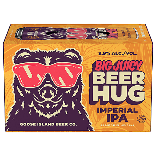 Goose Island Brewing Company Big Juicy Beer Hug Imperial IPA, 6 pack 12 fl. oz. Cans. This fruit forward Imperial IPA has an aroma bursting with a tropical bouquet of passionfruit, orange, and guava. Big Juicy Beer Hug finishes with a soft malty sweetness leaving you wanting more. Craft beer from Chicago. 9.9% alcohol by volume. Like a bear-hug….but from a beer. Enjoy responsibly.