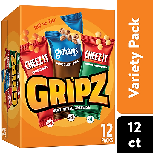 Get a grip on snacking bliss with mighty tiny Gripz baked snacks. This variety pack includes pouches of Cheez-It Gripz Original, Cheez-It Gripz White Cheddar, and Gripz Chocolate Chip Grahams. These mini, munchable crackers ignite happiness in every crunchy handful. Each Cheez-It Gripz pouch is filled with the bold cheese flavor you’d expect from your favorite Cheez-It crackers. Or satisfy your sweet tooth with some little chocolate chip graham bites; Next level munching begins with the easy-open pouch that’s meant to be poured by the handful. Grip, rip, and tip these treats for a flow of great-tasting crunch. You’ll be snacking like a boss. They’re clutch for no-mess snacking and slide into the side of backpacks for an anytime snack craving. Pack them in lunch boxes, devour as an afternoon snack, grab some for a study break, or share after the game (if you’re feeling generous). Forget the boring snacks - Gripz mighty tiny baked snack crackers fill your hand and dreams with a crunchy flavor explosion.