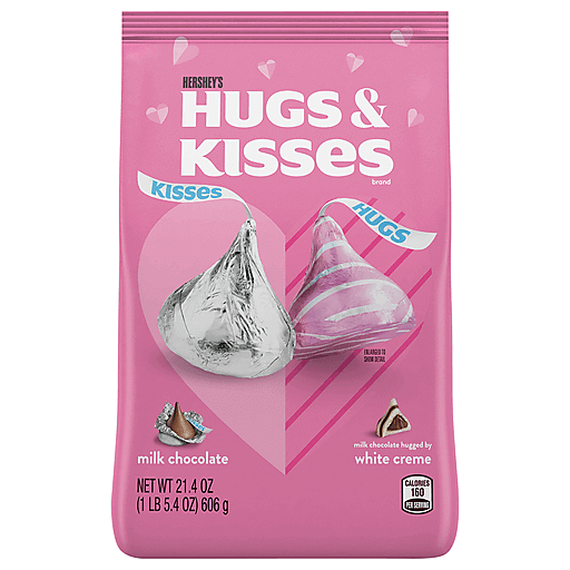 This HERSHEY'S HUGS & KISSES Valentine's Day milk chocolate and white creme candy assortment includes two delicious, creamy chocolate treats. HERSHEY'S HUGS candies are a delectable combination featuring HERSHEY'S milk chocolate hugged by sweet white creme, and HERSHEY'S KISSES candies are the classic milk chocolate treats you already know and love. Gift these bite size chocolates to a loved one or treat yourself at home, at work, or on the go. Individually wrapped in festive pink and silver foils and placed in an assortment bag for your sharing, gifting and snacking convenience, these treats are perfect for Valentine exchanges. Tuck a handful of milk chocolate or milk chocolate and white creme candies into favor bags, pair a bag with a bouquet of flowers or attach a few candies to each Valentine's Day card you give out this year. This mixed bag of milk chocolate and white creme sweets includes plenty of pieces, so you can gift them all to a special someone or share them with friends, family members, classmates and co-workers. Just don't forget to save a few treats for yourself amidst all of that sharing. Show your love this Valentine's Day with HERSHEY'S HUGS & KISSES treats your loved ones won't soon forget.