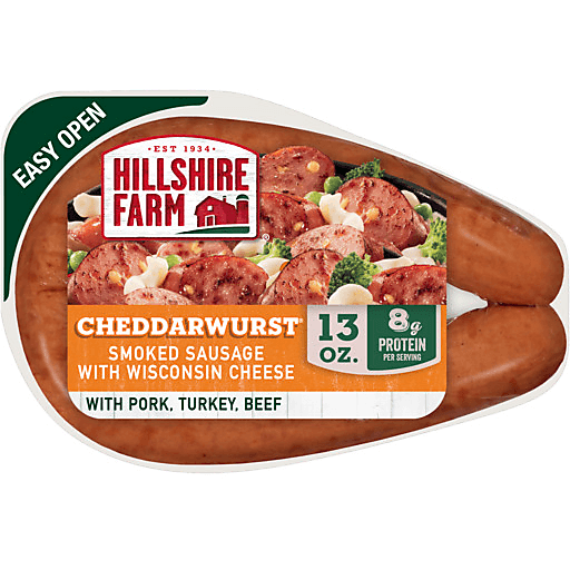 Hillshire Farm Cheddarwurst Smoked Sausage is a delicious answer to weeknight family dinners. Handcrafted with natural spices, real Wisconsin cheddar cheese and only our finest cuts of meat, this sausage features bold flavor in every bite. Simply heat this fully cooked sausage for snacks or meals. Keep this 13 oz package of Hillshire Farm Cheddarwurst smoked sausage in the refrigerator to maintain freshness.
