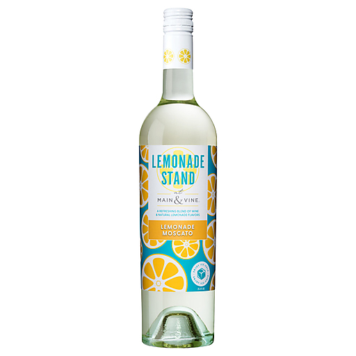Lemonade Stand at Main & Vine Lemonade Stand Moscato white wine is a sweet Moscato bursting with flavors of freshly-squeezed lemonade. This refreshing blend of wine and natural lemonade flavors delivers a bright, juicy finish. With 6.5% ABV, this wine is ideal for pairing with Asian cuisine, creamy brie, and grilled fish. Perfect for social gatherings and warm days, unwind by enjoying this chilled wine over ice. Comes in a 750ml bottle with a convenient screw cap for easy opening.