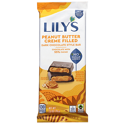 A salty and sweet snack is more than just a treat for a rough day, it's a moment of peace and calm that you deserve to find wherever and whenever you need it most. LILY'S Peanut Butter Creme Filled Dark Chocolate Style sweets bars provide you with these moments. Enjoy a sweet confection just for you, whether you're celebrating a special occasion or making an ordinary moment a little more memorable. This kosher certified, 55-percent cacao dark chocolate style peanut butter creme filled sweets bar is also made with stevia and other sweeteners and is free of added sugars. LILY'S sweets are perfect for celebrating all of life's special occasions and festivities. Show how much you care on holidays, birthdays and anniversaries with a gift of sweetness that suits your friends and family. Stuff Christmas stockings, Easter baskets, Valentine's Day gift bags and Halloween trick or treat bags with a sweets bar everyone can enjoy. Take a step away to enjoy a bite of peanut butter creme sweetness at school, at the office or during your latest adventure. No matter where life takes you, a LILY'S Peanut Butter Creme Filled Dark Chocolate Style sweets bar will be there to offer a delicious and creamy treat anytime.