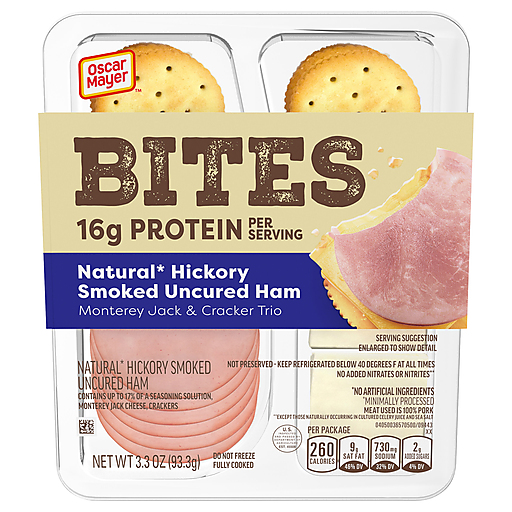 Elevate snack time with our thoughtfully crafted meat and cheese plate. Oscar Mayer Bites is a quick and delicious on-the-go snack. Slices of natural hickory smoked uncured ham, Monterey Jack cheese and butter crackers are a great part of a workplace lunch. Packed with 15 grams of protein to fuel your day, our snack kit is designed to deliver the perfect balance of flavor and convenience for your busy lifestyle. High-quality Oscar Mayer Natural deli meats contain no artificial ingredients. Our individually packaged snack provides a satiating midday boost when work keeps you busy. Keep our 3.3-ounce meat and cheese plate refrigerated at all times for ready-to-eat deliciousness straight from the fridge.