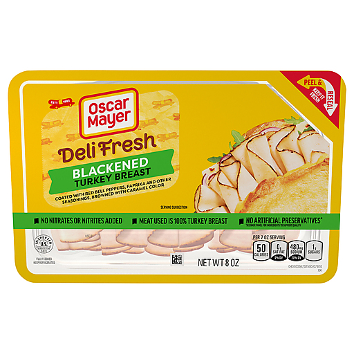 Skip the deli line and enjoy the sliced turkey you know, love and trust. Oscar Mayer Deli Fresh Blackened Turkey Breast delivers the flavorful slices you crave, coated with red bell peppers, paprika and other seasonings. Turkey slices are fully cooked and ready to enjoy. Made with no artificial preservatives and no nitrites or nitrates added, each serving of blackened turkey slices contains 9 grams of protein (see ingredient line for ingredients to support quality). Our Peel and Reseal feature ensures maximum freshness, thanks to our fully resealable lid that keeps every slice as delicious as the first. Whether you're stacking a sandwich, adding protein to your salad, crafting a charcuterie board or snacking straight from the fridge, you can count on the resealable packaging to lock in freshness after every use. Each 8-ounce pack of sliced turkey breast contains 4 servings. Keep it Oscar and enjoy deli-style turkey breast at home.
