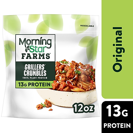 MorningStar Farms Grillers Crumbles are a meatless favorite that make busy-night meal prep easy. They're expertly seasoned and perfect for a variety of savory recipes. Use these vegan crumbles anytime you're looking for a delicious meat alternative to ground beef. Each serving is 100% plant protein, offers a good source of protein (16% daily value), and contains 73% less fat than regular ground beef crumbles*. Great for tacos, casseroles, pasta dishes, and more; simply season to your liking and add them to your favorite dish. They're easy to prepare. Store them in the freezer and heat in a skillet or microwave before eating. Tasty and versatile, these crumbles are sure to delight vegetarians and meat-lovers alike. Anytime is a great time for the delicious taste of MorningStar Farms Crumbles. *Regular ground beef crumbles, cooked (pan-browned), contain 10g total fat per serving (55g). MorningStar Farms Veggie Grillers Crumbles contain 2.5g total fat per serving (55g).