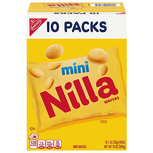 With NILLA Wafers Mini Wafer Cookies, the dessert possibilities are endless. These mini cookies are sweet, crispy, and artificially flavored vanilla wafers like their regular-sized counterparts, but their smaller size makes them convenient for grabbing and snacking. Mini NILLA Wafers are great for topping banana pudding, cakes, and cupcakes or creating mini ice cream sandwiches or vanilla pudding cups. These vanilla-flavored cookies are deliciously sweet snacks. Offered in individual snack packs ideal for school lunch snacks and office snacks, they are wonderful for enjoying on the go or in the comfort of your own home. Whether you're in the mood for something sweet to pair with your afternoon tea or coffee or preparing a homemade dessert for a family get together, NILLA Wafers are always a delicious option. Each box contains 10 conveniently portable 1-ounce single-serve snack packs of NILLA Wafers Mini Cookies.