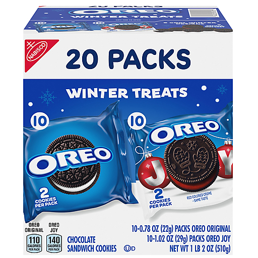 Spread joy this holiday season with the OREO Winter Treats Holiday Cookies Variety Pack, featuring the classic OREO sandwich cookies you’ve always loved with a festive Christmas twist. The cookie mix includes 10 packs of original OREO Chocolate Sandwich Cookies, that are Always Made with Real Cocoa, and 10 packs of OREO Joy! Holiday Cookies with red-colored classic OREO creme and six assorted winter designs. Each snack pack contains two full-size OREO cookies, making these OREO cookie packs a fantastic alternative to Christmas candy. OREO sandwich cookies are sweet treats to enjoy during Christmas movies, and the two-cookie snack packs are wonderfully fun snacks to use as stocking stuffers and cute holiday gifts for friends, family, coworkers, and neighbors. These certified kosher snack cookies also make wonderful office snacks, school snacks, and holiday party snacks, so toss these holiday treats in lunchboxes to surprise loved ones or in Christmas treat bags and cookie boxes as party favors. Milk's favorite cookie is sure to spark joy, and with this bulk cookies box of individually wrapped snacks that are ready to grab and go, you’ll be ready for the holiday season and any snacking occasion.