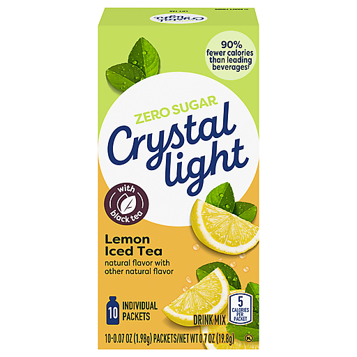 Crystal Light Naturally Flavored Lemon Iced Tea On-The-Go Powdered Drink Mix is a refreshing beverage you can enjoy at any time of day. With zero grams of sugar and only 5 calories per packet, Crystal Light is a sweet alternative to juice and soda and has 90 percent fewer calories than leading beverages (this product 5 calories, leading beverages 100 calories), so you don't have to choose between taste and calories. It's also made with real black tea for a refreshingly smooth taste. Each 0.07 ounce individual packet in this 10 count box of powdered iced tea mix fits easily in your bag, pocket or car, so you can enjoy refreshing Crystal Light anywhere. Simply empty one drink mix packet into a bottle of water or a glass with 2 cups of water, shake or stir, and enjoy! All the flavor and only 5 calories, just the way you like it.