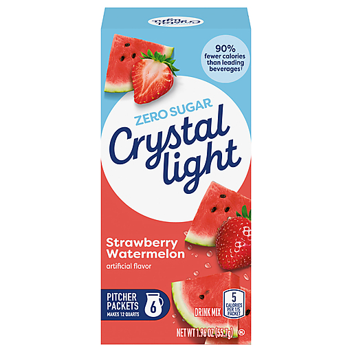 Crystal Light Artificially Flavored Strawberry Watermelon Powdered Drink Mix is a refreshing beverage you can enjoy at any time of day. With zero grams of sugar and only 5 calories per serving, Crystal Light is a sweet alternative to juice and soda and has 90 percent fewer calories than leading beverages (this product 5 calories, leading beverages 100 calories), so you don't have to choose between taste and calories. The fruity watermelon strawberry flavor offers a refreshingly smooth taste. Each pitcher packet of powdered fruit drink mix in this 6 count canister is perfectly portioned to make 2 quarts or 1 pitcher of Crystal Light watermelon strawberry fruit drink, so there's plenty to share with family and friends. Simply mix one fruit drink packet with 8 cups or 2 quarts of water, stir, and enjoy! All the flavor and only 5 calories, just the way you like it.