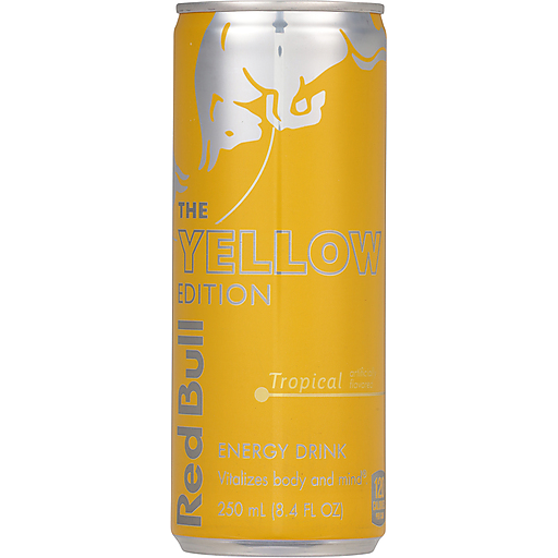 This Red Bull Yellow Edition features the exotic taste of tropical fruit. This lightly carbonated beverage is enjoyed worldwide by fitness enthusiasts, athletes, gamers, students and travelers. A refreshing can of Red Bull makes an excellent partner for busy, active lifestyles. Each 8.4 fl oz can contains 80mg of caffeine per serving (about the same amount as a home-brewed cup of coffee) and 28g of sugar (comparable to sugar levels found in apple juice). It also includes Taurine, an amino acid naturally occurring in the human body, and B-group vitamins B6, B12, Niacin (B3) and Pantothenic Acid (B5). Available in 4-packs, 12-packs, 24-packs and Variety Packs. Comes in aluminum cans that can be recycled over and over. Always check can labels for most updated product nutritional and ingredient information. Calcium and sugars values declared on labels may vary slightly depending on production locations.