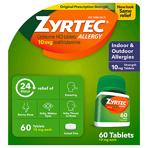 Zyrtec Allergy Relief Medicine Tablets relieve your worst indoor and outdoor allergy symptoms, including those from seasonal allergies, pet allergies, and more. 10 milligrams of cetirizine hydrochloride per antihistamine tablet, this prescription-strength allergy relief medicine provides 24 hours of relief from common symptoms of hay fever and other upper respiratory allergies, including runny nose, sneezing, itchy, watery eyes, and itching of the nose or throat. From the #1 allergist-recommended brand among OTC oral antihistamines, these all-day anti-allergy tablets effectively treat indoor allergies caused by dust, mold, and pet dander, as well as outdoor seasonal allergies from tree pollen, weeds, and grasses. For fast and effective allergy symptom relief, this 24 hour allergy relief medicine starts working at hour 1 and works twice as hard when you take it again the next day. Suitable for ages 6 and up, Zyrtec Tablets offers lasting relief from your worst allergy symptoms.