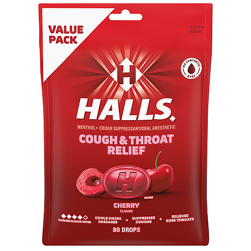 HALLS Relief Cherry Cough Drops are ready for whatever life throws, or coughs, your way. With 5.8 mg of menthol per drop, these cough drops relieve coughs, soothe sore throats and cool nasal passages to relieve your worst symptoms. These cough suppressant drops come in a tasty cherry flavor that is both refreshing and soothing. Whether you're using HALLS cough drops for sore throat relief, cough relief or as an oral anesthetic, dissolve one drop in your mouth slowly, and repeat every two hours as needed. HALLS Relief menthol cough drops are formulated for adults and children five years and older. Each package holds 80 drops and is resealable to easily toss in your bag or travel pack for convenient access when symptoms strike.
