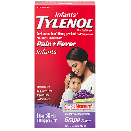 Infants' Tylenol Oral Suspension provides temporary relief from your child's minor aches and pains due to the common cold, flu, sore throat, headache, toothache. The formula of this liquid medicine also temporarily reduces fever and starts working in as little as 15 minutes. Each 5 milliliter dose contains 160 milligrams of acetaminophen, a known pain reliever and fever reducer. Infants' Tylenol is the #1 pediatrician-recommended brand for teething pain and is gentle on little tummies with a kid-friendly grape flavor. It includes a SimpleMeasure syringe with dosing for children 2 to 3 years of age. For dosing information for children 2 years and under, ask your healthcare professional. Help provide relief for your baby with Tylenol, the #1 pediatrician-recommended brand of pain reliever and fever reducer.