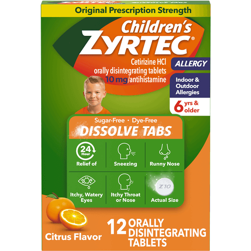 Children's Zyrtec Allergy Relief Dissolving Tablets in a citrus flavor with 10 mg of Cetirizine Hydrochloride can give your child effective, all-day relief from allergy symptoms caused by seasonal allergies, hay fever and other upper respiratory allergies. This dissolvable prescription-strength antihistamine allergy medicine for kids provides 24-hour relief of symptoms such as runny nose, sneezing, itchy and watery eyes, and itching of the nose and throat. With 10 milligrams of the antihistamine cetirizine hydrochloride in each tablet, this children's allergy medicine melts in the mouth with a kid-friendly citrus flavor. These orally dis-integrating allergy tablets are intended for children 6 years and older. Zyrtec allergy tablets provide consistently powerful indoor, outdoor, and seasonal allergy relief for your kids' allergies and can be taken with or without water.