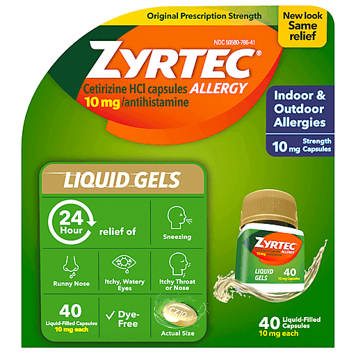 Zyrtec Allergy Relief Liquid Gels provide 24-hour relief of your worst indoor and outdoor allergy symptoms. With 10 milligrams of the antihistamine cetirizine hydrochloride per capsule, this prescription-strength allergy medicine starts working hard at hour 1 and works twice as hard when you take it again the next day. This seasonal allergy medicine provides relief from symptoms caused by hay fever and other upper respiratory allergies, including runny nose, sneezing, itchy, watery eyes, and itching of the nose or throat. From the #1 allergist-recommended brand among OTC oral antihistamines, this cetirizine hydrochloride anti-allergy medicine is effective in treating indoor allergies from dust, mold, and pet dander, and outdoor allergies caused by tree pollen, weeds, and grasses. Zyrtec all-day allergy relief antihistamine capsules with cetirizine HCl are suitable for adults and children six years and older, with one dose providing effective allergy relief for a full 24 hours.