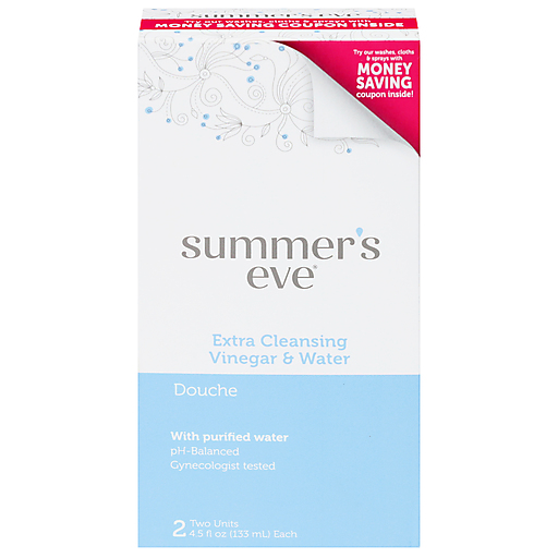Summer’s Eve Douche, Extra Cleansing Vinegar & Water, Odor Reducing Vaginal Douche for Women is gynecologist-tested and pH-balanced to match the natural pH range of a healthy vagina . This feminine douche is gentle, non-irritating, and not tested on animals and helps reduce vaginal odor. Use for a vaginal rinse after your period, before or after intimacy, after a workout, or any time you want an advanced cleansing to reduce odor. Summer’s Eve vaginal douches for women feature a soft and flexible nozzle that’s easy and comfortable to use. One box contains two disposable douches, each individually wrapped and pre-filled so they’re ready to use when you are. Each douche has a soft, flexible nozzle for a comfortable clean so you are ready to take on anything. Summer’s Eve Feminine Douches are available in a variety of scents and sizes. Be sure to check out Summer's Eve Feminine Washes, Body Wipes, and refreshing Sprays for all your feminine care needs.