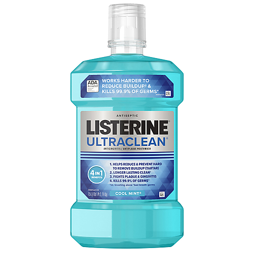 Give your mouth a powerful, dentist-clean feeling with Listerine Ultraclean Antiseptic Mouthwash with Cool Mint flavor for gingivitis treatment. This oral care mouthwash fights tartar buildup & kills 99.9% of germs that cause bad breath, plaque & gingivitis & provides up to 3x longer lasting clean feeling versus brushing alone. This tartar control mouthwash helps maintain healthy gums with an added anti-tartar ingredient. The Cool Mint flavor of the oral rinse combined with Listerine Everfresh technology will help to prevent buildup. Accepted by the American Dental Association (ADA), achieve maximum results by rinsing with this mouthwash for 30 seconds twice a day. This oral mouth rinse with Listerine Everfresh technology helps prevent tartar buildup.