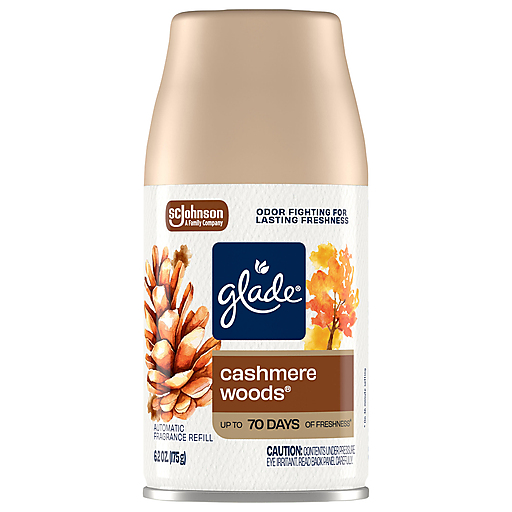 The perfect excuse to stay in and snuggle up with Glade Comforting Cashmere Woods Automatic Spray Refill. Get all up in those fuzzy feels with scent diffuser with notes of jasmine petals, creamy sandalwood, and musk. Glade air freshener fragrance is crafted by master perfumers. Switch things up with automatic air freshener dispenser in Comforting Cashmere Woods scent. Open the unit by squeezing the ribs on the side while pulling sides of holder apart. Insert Glade automatic spray refill and choose the time setting to release fragrance. This automatic air freshener spray gives a fresh burst every 9, 18 or 36 minutes. Surround yourself with room freshener fragrance infused with essential oils and create the coziness you’re craving.