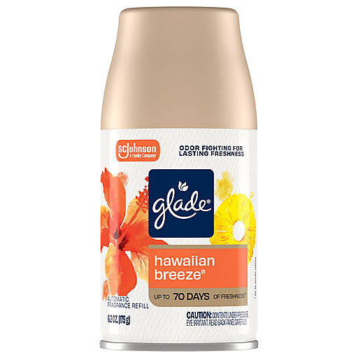 Transport yourself to an instant vacay with Glade Hawaiian Breeze Automatic Spray Refill. Say Aloha to relaxation with scent diffuser with notes of ripe pineapple, melon, and peach nectar. Glade air freshener fragrance is crafted by master perfumers. Switch things up with automatic air freshener dispenser in Hawaiian Breeze fruity scent. Open the unit by squeezing the ribs on the side while pulling sides of holder apart. Insert Glade automatic spray refill and choose the time setting to release fragrance. This automatic air freshener spray gives a fresh burst every 9, 18 or 36 minutes. Surround yourself with room freshener fragrance infused with essential oils and take yourself on an exotic vacation from the comfort of your couch.