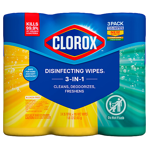 Clean feels good when you clean with Clorox Disinfecting Cleaning Wipes, now with new sparkling scents. These wipes deliver an effective clean and sparkling scent with every wipe. Safe to use on over 100 surfaces, including finished wood, sealed granite, glass and stainless steel, the Clorox Disinfecting Wipes you know and trust are ideal for the kitchen, bathroom and high touch areas. This variety pack includes 2 Crisp Lemon and 1 Fresh Scent canisters of bleach free wipes that fight odor causing bacteria for 48 hours on non food contact surfaces when used as directed. Tackle messes effortlessly with Clorox wipes that clean 3X better than a wet paper towel, allowing you to clean more with one wipe (1). Clorox Disinfecting Wipes kill 99.9% of germs, including Pseudomonas aeruginosa, Salmonella enterica and Staphylococcus aureus, when used as directed on hard, nonporous surfaces.