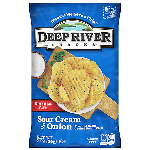 Deep River Snacks® Krinkle Cut Potato Chips Sour Cream & Onion. Cooked exclusively in sunflower oil. Never a blend! Because We Give A Chip®! 10% of profit to charity. Non GMO ingredients. Flavored kettle cooked potato chips. Certified GF, Gluten Free®. 140 calories per 1 oz serving. 290 calories per bag. Net wt 2 oz (56 g).