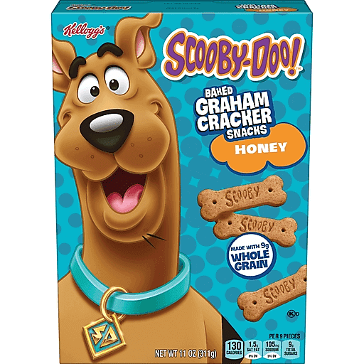 Snack time is a little sweeter with Kellogg's SCOOBY-DOO! Honey Baked Graham Cracker Snacks. These fun treats are inspired by lovable Scooby-Doo and his favorite Scooby Snacks. Featuring delightfully crispy, sweet graham crackers shaped in fun dog-bone shapes for the yummiest snacking imaginable. These delicious snacks have been baked to perfection and are made with pantry-perfect staples like whole wheat flour and honey for a satisfying treat wherever you go; No matter your age, Kellogg's SCOOBY-DOO! Honey Graham Cracker Snacks are perfect for snacks at school, the office, traveling, lunchtime, at the game, and more. Enjoy them as a quick, sweet treat or as the base for pie crusts, cookie bars, and more. Or try dipping them into peanut butter, your favorite pudding, or sweet dips for a next-level treat. The options are endless. Satisfy your sweet treat craving with the simple goodness of Kellogg's SCOOBY-DOO! Honey Graham Cracker Snacks.