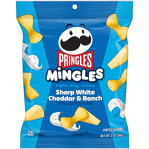 Pringles Mingles Sharp White Cheddar and Ranch are the light, airy, crispy puffed snacks that deliver two tasty flavors on one bowtie shaped puff! You’ve never seen Pringles quite like this before. We’ve created a delicious Pringles snack that's out of the can and into a bag. Every craveable bite is light, airy, and crispy on the outside, melt-in-your-mouth on the inside, and mixes two flavors for a delicious and satisfying snack experience; Pop open a bag and enjoy bite-sized, flavor-packed crispiness in a puffably fun bowtie shape. Pringles Mingles combines two flavors on every puff. Kick back and enjoy the savory, tangy combination of sharp white cheddar paired with zesty buttermilk and herb ranch. Whether you’re prepping for your next TV binge or hanging with the crew, get the ultimate snack fix with these irresistibly craveable puffs you can eat by the handful. Grab a bag of Pringles Mingles Sharp White Cheddar and Ranch and get ready to mix, mingle, and munch with Pringles.