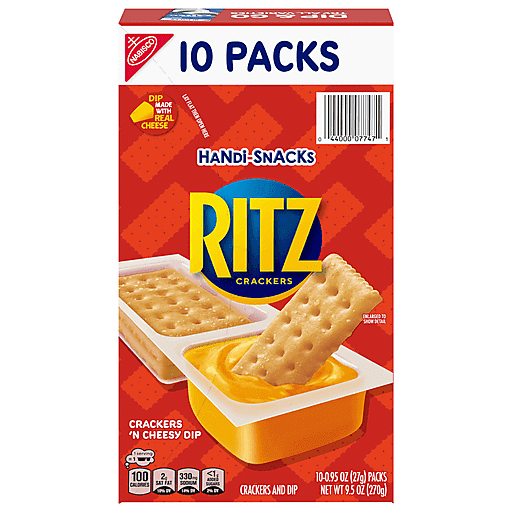 RITZ Handi-Snacks Crackers and Cheese Dip pairs the rich, buttery taste of RITZ snack crackers with a cheesy dip made with real cheese. Each of these tasty cracker packs contains 100 calories per serving. These cheese and crackers snack packs are individually portioned and do not require refrigeration, making them a perfectly portable, go-anywhere option. Add a cracker snack pack to your lunchbox, toss one in your purse or backpack for a fast bite to eat, or simply keep a stash in your pantry as a grab-and-go option for busy days. Each package contains six 0.95 ounce single serve snack packs.