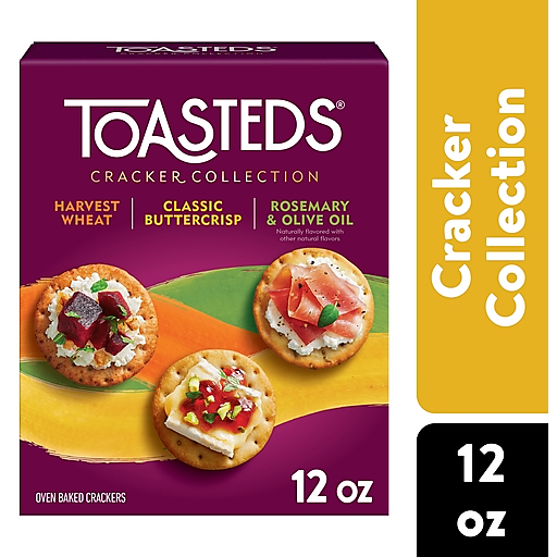 Take your entertaining to the next level with Toasteds crackers. These lightly toasted crackers made with delicious flavors are toasted to perfection. This Toasteds Cracker Collection includes Harvest Wheat, Classic Buttercrisp, and Rosemary and Olive Oil flavors. Made without high fructose corn syrup, these crackers let the quality ingredients speak for themselves. Keep a box on hand to serve guests, enjoy as a quick snack between activities, or bring a touch of sophistication to your work lunch; Toasteds make a sophisticated addition to gatherings, no matter how impromptu. Next time you host a cocktail party or wine night with friends, consider including Toasteds crackers to add flair to the table. Their subtle complexity elevates the overall taste while complementing fine cheeses, charcuterie, olives, and other upscale offerings. Any time is right for the light, perfectly toasted flavor of Toasteds crackers.