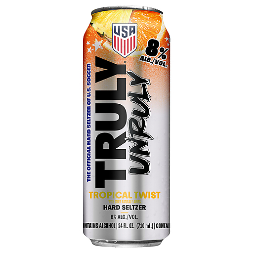 Introducing the NEW! Truly Unruly Tropical Twist. It's hard seltzer turned up to 8% ABV. Whoever said "nothing good happens after dark" clearly hasn't tried Truly Unruly. Think of it as the cooler cousin of everyone's favorite hard seltzer – sure, it's got the family genes (refreshment, light flavor, 12 fluid ounces), but that’s where the similarities stop. It's turned up to 8% and is always ready to bring the fun! Truly Unruly Hard Seltzer is the rare drink that keeps you on your toes (not in your seat). Truly Unruly breaks the rules of what a high alcohol seltzer can taste like: because it actually tastes GOOD! Gluten free. Single, 24 fluid ounce can.