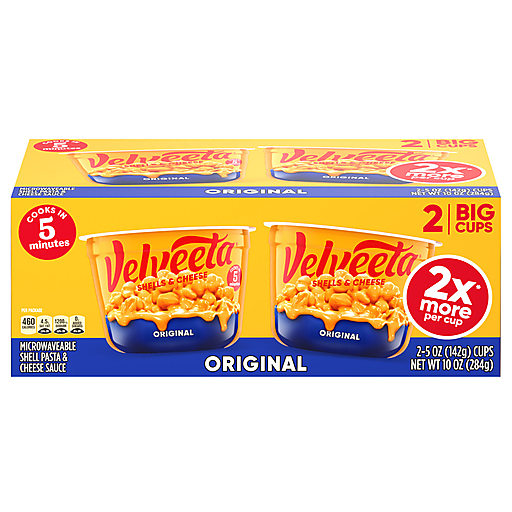 Go all in on more of the things you love. Live life to the creamiest with Velveeta Shells & Cheese Original Microwaveable Big Cup. Each 5 oz cup in our 2-pack offers 2x* more food per cup compared to our original cup size (*142 grams as compared to 68 grams in regular Velveeta cups). When your drip is as smooth as ours, you don’t waste time when it comes to delicious indulgence. For instant cheesy gratification, our original recipe hits the mark, with iconic, velvety meltability and tender pasta shells that grip the drip like no other. Velveeta’s supremely creamy texture and rich, savory taste satisfy your cravings any day of the week. Amp things up by customizing our cheesy pasta with added veggies, meat, toppings or seasonings. Sometimes unnecessary is necessary, so kick back, relax and embrace the flavor. Whether it’s in the form of a snack, side dish or part of a meal, preparing our luxuriously convenient single-serve Velveeta Shells & Cheese Big Cup is a breeze. Simply peel back the top, remove sauce pouch, add water up to the fill line, microwave for 5 minutes, stir in the liquid gold cheese sauce and enjoy, unapologetically. That’s La Dolce Velveeta!